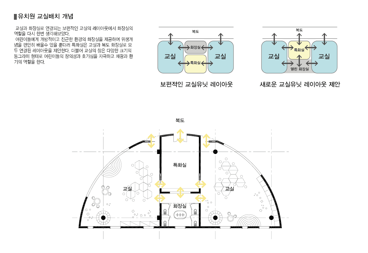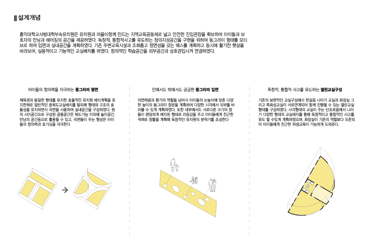 The Hongik University Kindergarten shares its campus with Kyungsung Middle and High Schools, as well as Hongik Design High School. With careful consideration to complement the existing buildings and optimize the available space, an efficient rectangular form has been planned. the Circle Kindergarten focuses on nurturing imagination and creativity through form, color, and space.